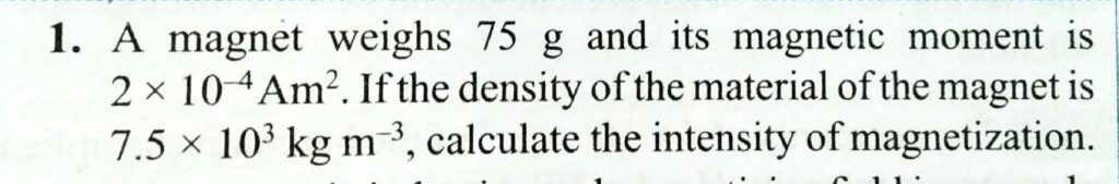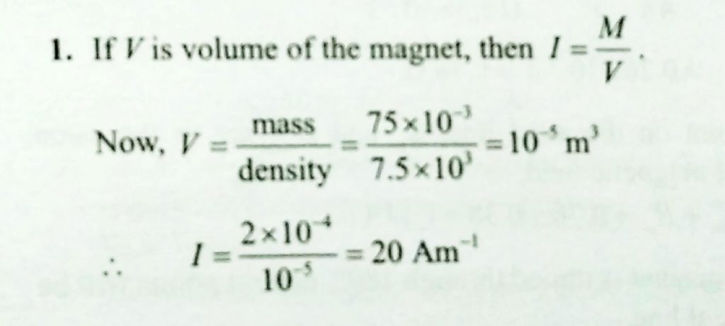 A magnet weighs 75 g and its magnetic moment is 2 x 10^-4 Am^2. If the density of the material of the magnet is 7.5 x 10^3 kg/m^3, calculate the intensity of magnetization . A magnet weighs 75 g and its magnetic moment is 2 x 10^-4 Am^2. If the density of the material of the magnet is 7.5 x 10^3 kg/m^3 calculate the intensity of magnetization . October 18, 2020 Category: Uncategorised (JEE Advanced Physics by BM Sharma + GMP Solutions) , Facebook Messenger WhatsApp Share this:TwitterFacebook Related