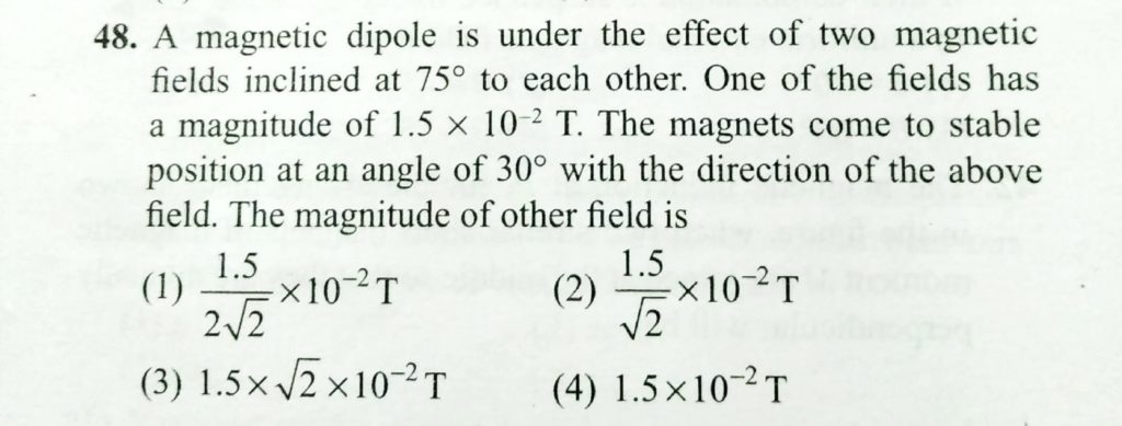 A magnetic dipole is placed under the effect of two magnetic fields inclined at 75 ∘ to each other. One of the fields has a magnetic induction of 1.5 × 10^ −2 T. The magnet comes to rest at an angle of 30 o with the direction of this field. The magnitude of the other field is: