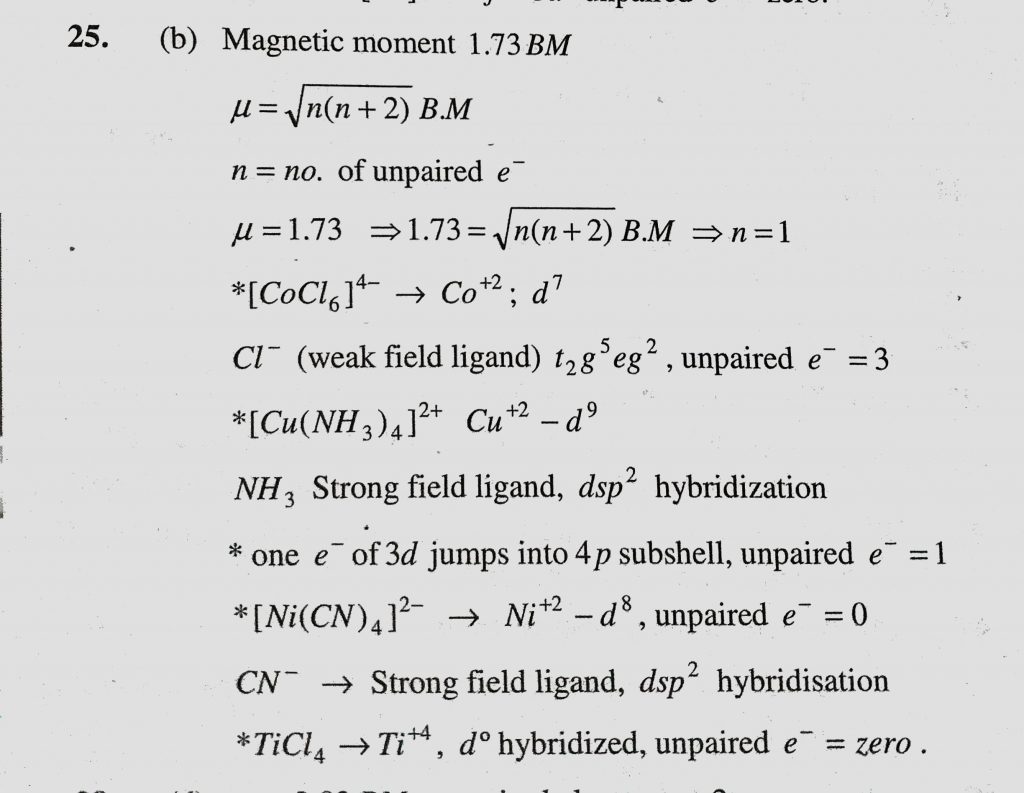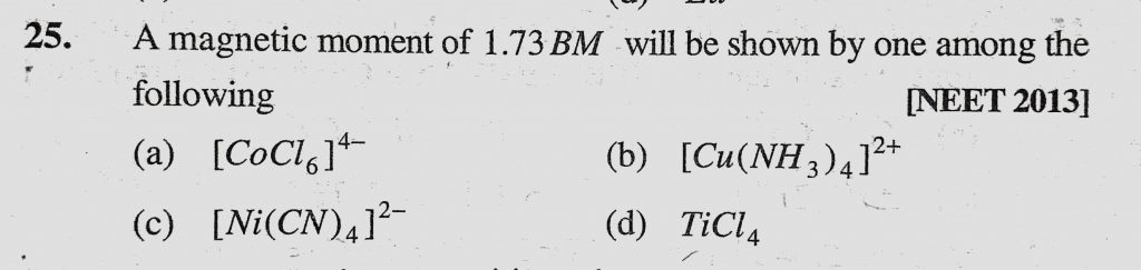 A magnetic moment of 1.73 BM will be shown by one among the following (a) (CoCl6) 4- (b) (cu(NH3)4) 2+ A magnetic moment of 1.73 BM will be shown by one among the following (a) (CoCl6) 4- (b) (cu(NH3)4) 2+ November 29, 2020 Category: Uncategorised (JEE Advanced Physics by BM Sharma + GMP Solutions) , Facebook Messenger WhatsApp Share this:TwitterFacebook Related