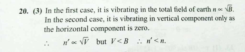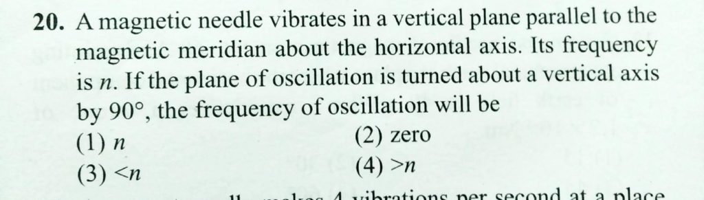 A magnetic needle vibrates in a vertical plane parallel to the magnetic meridian, about a horizontal axis passing through its centre. Its frequency is n. If the plane of oscillation is turned about a vertical axis by 90°, the frequency of its oscillation in vertical plane will be