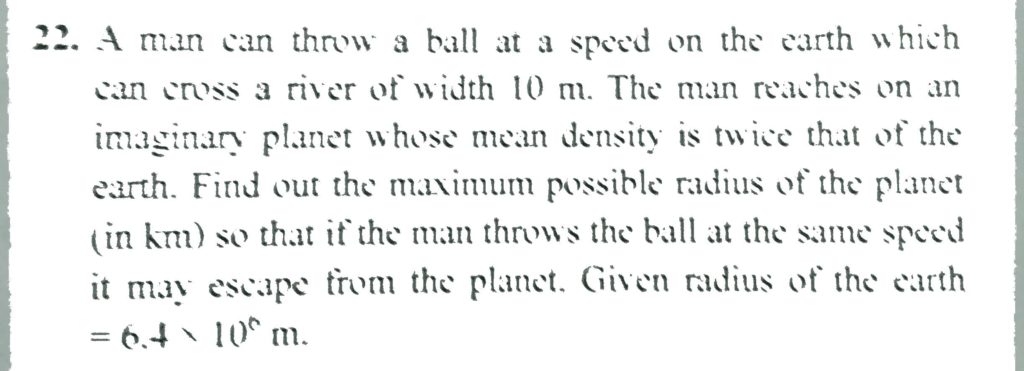 A man can throw a ball at a speed on the earth which can cross a river of width 10 m. Ravi reaches on an imaginary planet whose mean density is twice that of the earth. Find out the maximum possible radius of the planet so that if Ravi throws the ball at the same speed it may escape from the planet. Given radius of the earth = 6.4 × 10^6 m.