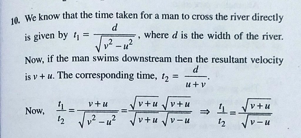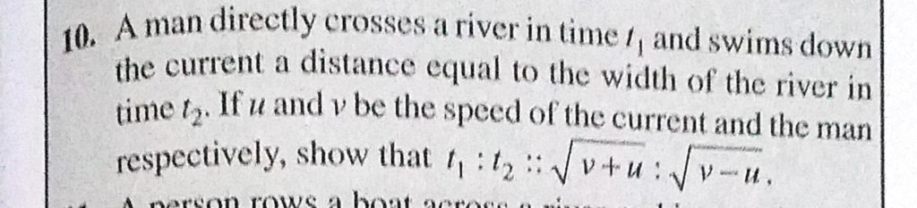 A man directly crosses a river in time t1 and swims down the current a distance equal to the width of the river in time t2. If u and v be the speed of the current and the man respectively, show that t1 : t2 :: root v +u : root v – u. A man directly crosses a river in time t1 and swims down the current a distance equal to the width of the river in time t2. If u and v be the speed of the current and the man respectively show that t1 : t2 :: root v +u : root v - u. September 21, 2020 Category: Uncategorised (JEE Advanced Physics by BM Sharma + GMP Solutions) , Facebook Messenger WhatsApp Share this:TwitterFacebook Related