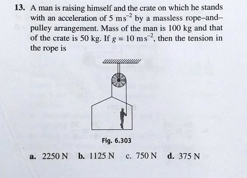 A man is raising himself and the crate on which he stands with an acceleration of 5 m/s^2 by a massless rope and pulley arrangement. Mass of the man is 100 kg and that of the crate A man is raising himself and the crate on which he stands with an acceleration of 5 m/s^2 by a massless rope and pulley arrangement. Mass of the man is 100 kg and that of the crate September 29, 2020 Category: Uncategorised (JEE Advanced Physics by BM Sharma + GMP Solutions) , Facebook Messenger WhatsApp Share this:TwitterFacebook Related