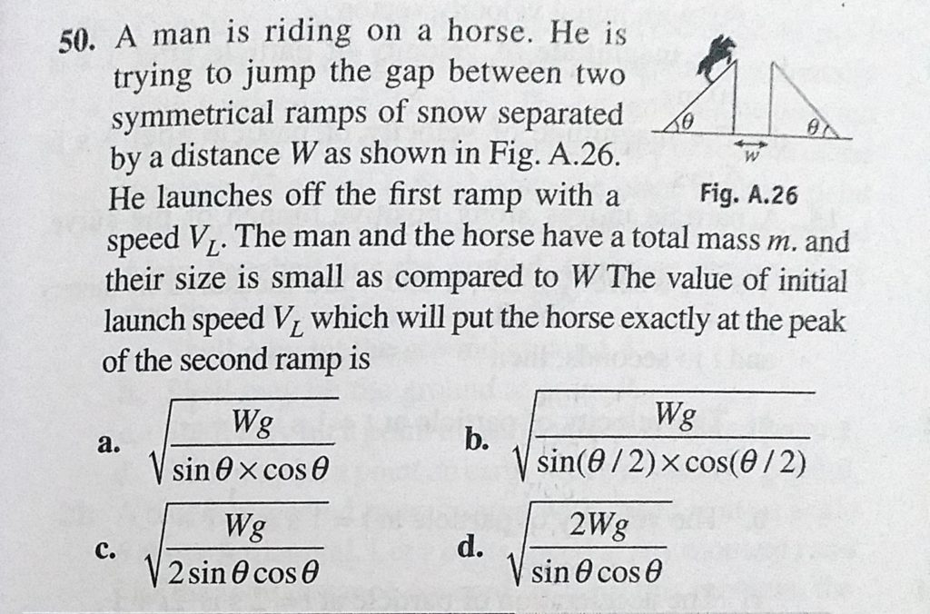 A man is riding on a horse. He is trying to jump the gap between two symmetrical ramps of snow separated by a distance W as shown in Fig. A.26. He launches off the first ramp with a speed Vl. A man is riding on a horse. He is trying to jump the gap between two symmetrical ramps of snow separated by a distance W as shown in Fig. A.26. He launches off the first ramp with a speed Vl. September 24, 2020 Category: Uncategorised (JEE Advanced Physics by BM Sharma + GMP Solutions) , Facebook Messenger WhatsApp Share this:TwitterFacebook Related