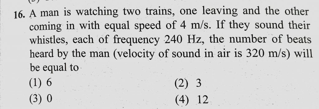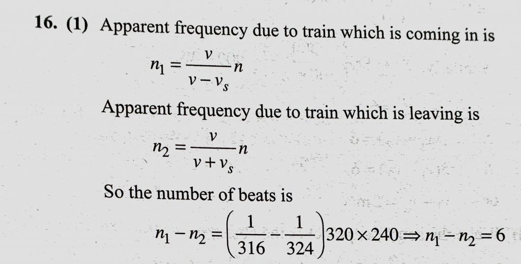 A man is watching two trains, one leaving and the other coming in with equal speed of 4 m/s. If they sound their whistles, each of frequency 240 Hz, the number of beats heard A man is watching two trains each of frequency 240 Hz one leaving and the other coming in with equal speed of 4 m/s. If they sound their whistles the number of beats heard November 7, 2020 Category: Uncategorised (JEE Advanced Physics by BM Sharma + GMP Solutions) , Facebook Messenger WhatsApp Share this:TwitterFacebook Related
