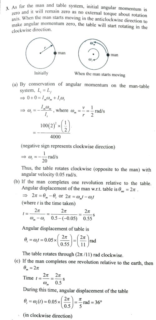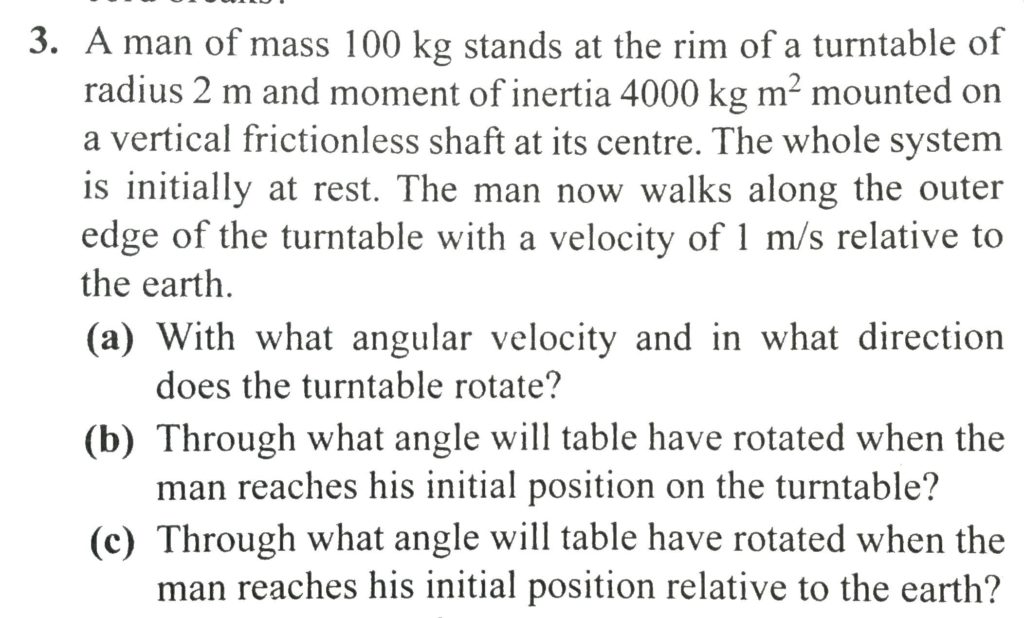 A man of mass 100 kg stands at the rim of a turntable of radius 2 m and moment of interia 4000 kg m^2 mounted on a vertical frictionless shaft at its centre. THe whole system is initially at rest. The man now walks along the outer edge of the turnable with a velocity of 1 m/s relative to the earth.