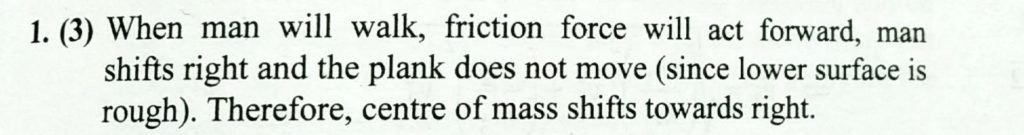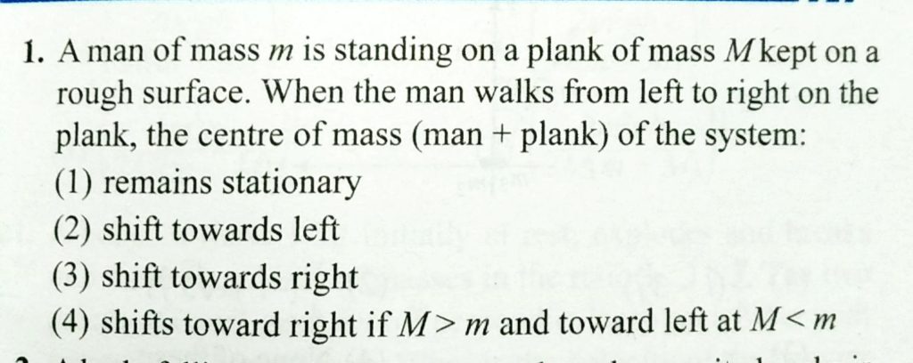 A man of mass m is standing on a plank of mass M kept on a rough surface. When the man walks from left to right on the plank, the centre of mass ( man + plank ) of the system A man of mass m is standing on a plank of mass M kept on a rough surface. When the man walks from left to right on the plank the centre of mass ( man + plank ) of the system September 20, 2020 Category: Uncategorised (JEE Advanced Physics by BM Sharma + GMP Solutions) , Facebook Messenger WhatsApp Share this:TwitterFacebook Related