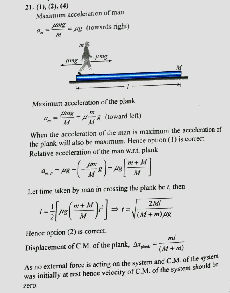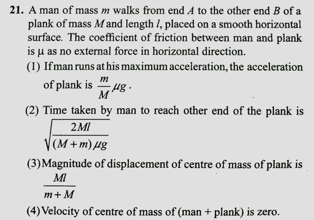 A man of mass m walks from end A to the other end B of a plank of mass M and length l, placed on a smooth horizontal surface. The coefficient of friction between man and plank is mu as no external in horizontal direction. A man of mass m walks from end A to the other end B of a plank of mass M and length l placed on a smooth horizontal surface. The coefficient of friction between man and plank is mu as no external in horizontal direction. September 21, 2020 Category: Uncategorised (JEE Advanced Physics by BM Sharma + GMP Solutions) , Facebook Messenger WhatsApp Share this:TwitterFacebook Related