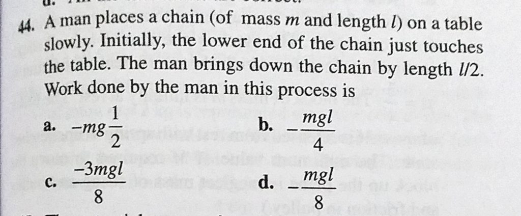 A man places a chain (of mass m and length l) on a table slowly. Initially, the lower end of the chain just touches the table. The man brings down the chain by length l/2. Work done A man places a chain (of mass m and length l) on a table slowly. Initially the lower end of the chain just touches the table. The man brings down the chain by length l/2. Work done October 4, 2020 Category: Uncategorised (JEE Advanced Physics by BM Sharma + GMP Solutions) , Facebook Messenger WhatsApp Share this:TwitterFacebook Related