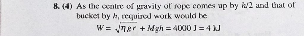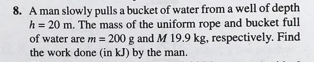 A man slowly pulls a bucket of water from a well of depth h = 20 m. The mass of the uniform rope and bucket full of water are m = 200 g and M 19.9 kg, respectively. Find the work done by the man. A man slowly pulls a bucket of water from a well of depth h = 20 m. The mass of the uniform rope and bucket full of water are m = 200 g and M 19.9 kg respectively. Find the work done by the man. October 5, 2020 Category: Uncategorised (JEE Advanced Physics by BM Sharma + GMP Solutions) , Facebook Messenger WhatsApp Share this:TwitterFacebook Related