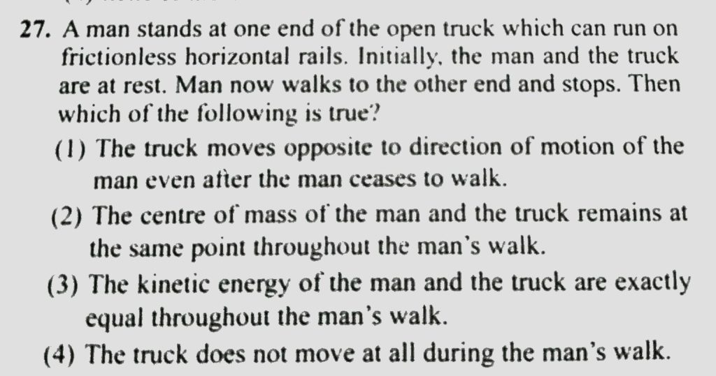 A man stands at one end of the open truck which can run on frictionless horizontal rails. Initially, the man and the truck are at rest. Man now walks to the other end and stops. Then which of the following is true? A man stands at one end of the open truck which can run on frictionless horizontal rails. Initially the man and the truck are at rest. Man now walks to the other end and stops. Then which of the following is true? September 21, 2020 Category: Uncategorised (JEE Advanced Physics by BM Sharma + GMP Solutions) , Facebook Messenger WhatsApp Share this:TwitterFacebook Related