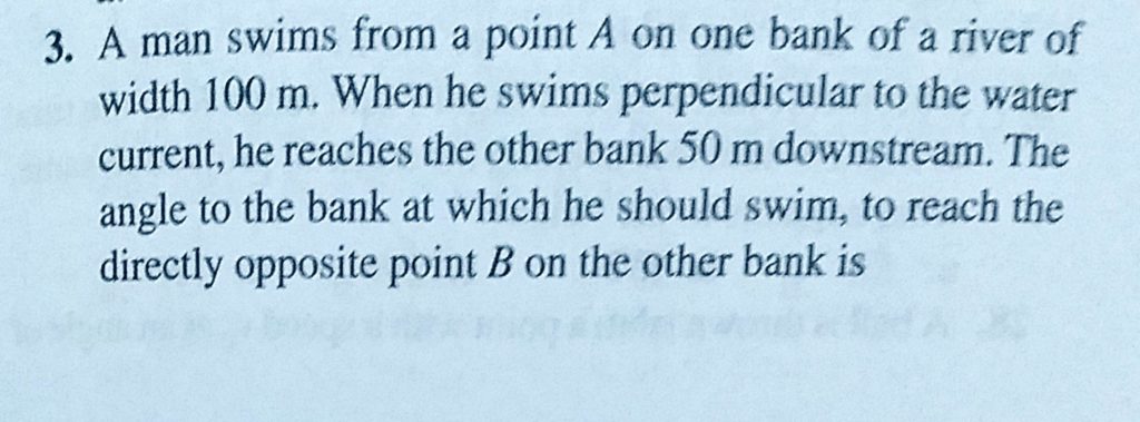 A man swims from a point A on one bank of a river of width 100 m. When he swims perpendicular to the water current, he reaches the other bank 50 m downstream. The angle to the bank A man swims from a point A on one bank of a river of width 100 m. When he swims perpendicular to the water current he reaches the other bank 50 m downstream. The angle to the bank September 22, 2020 Category: Uncategorised (JEE Advanced Physics by BM Sharma + GMP Solutions) , Facebook Messenger WhatsApp Share this:TwitterFacebook Related