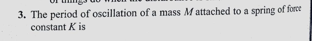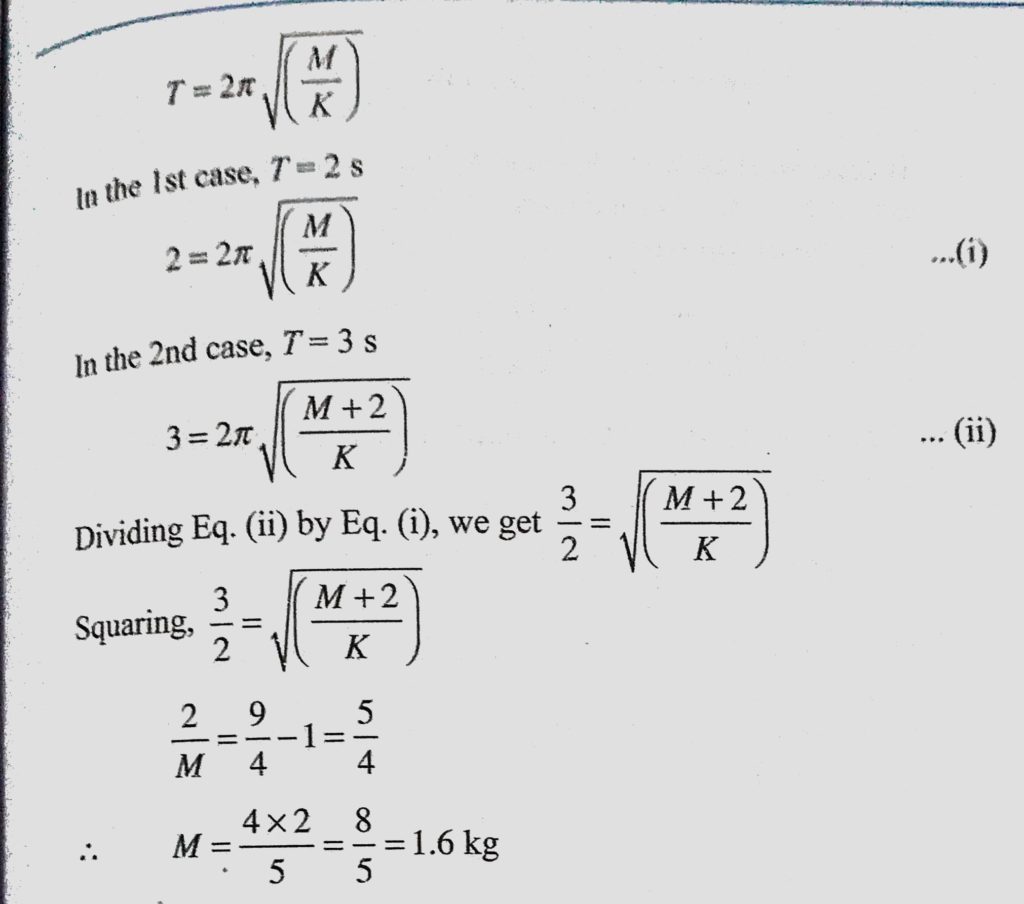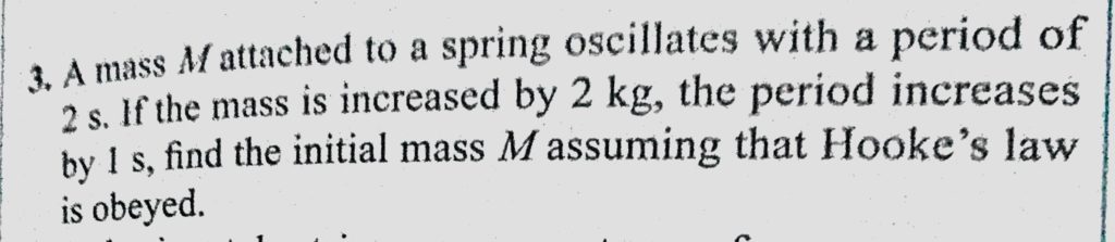A mass M attached to a spring oscillates with a period of 2 s. If the mass is increased by 2 kg, the period increases by 1 s, find the initial mass M assuming that Hooke’s law is obeyed. A mass M attached to a spring oscillates with a period of 2 s. If the mass is increased by 2 kg find the initial mass M assuming that Hooke's law is obeyed. the period increases by 1 s October 30, 2020 Category: Uncategorised (JEE Advanced Physics by BM Sharma + GMP Solutions) , Facebook Messenger WhatsApp Share this:TwitterFacebook Related