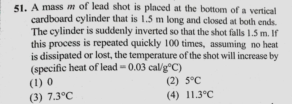 A mass m of lead shot is placed at the bottom of a vertical cardboard cylinder that is 1.5 m long and closed at both ends. The cylinder is suddenly inverted so that the shot falls 1.5 m. A mass m of lead shot is placed at the bottom of a vertical cardboard cylinder that is 1.5 m long and closed at both ends. The cylinder is suddenly inverted so that the shot falls 1.5 m. October 24, 2020 Category: Uncategorised (JEE Advanced Physics by BM Sharma + GMP Solutions) , Facebook Messenger WhatsApp Share this:TwitterFacebook Related