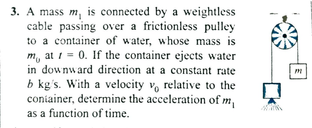 A mass m1 is connected by a weghtless cable of water, whose mass is m0 at t=0. If the container efects water in downward directiona t a constant rate bkg/s. with a velocity v0 relative to the container, determine the acceleration of m1 as a function of time.