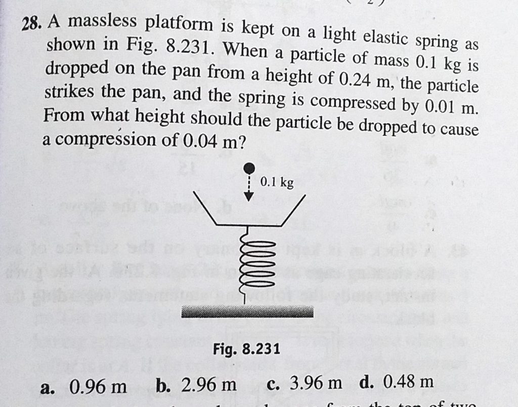 A massless platform is kept on a light elastic spring as shown in Fig. 8.231. When a particle of mass 0.1 kg is dropped on the pan from a height of 0.24 m, the particle strikes the pan, and the spring is A massless platform is kept on a light elastic spring as shown in Fig. 8.231. When a particle of mass 0.1 kg is dropped on the pan from a height of 0.24 m and the spring is the particle strikes the pan October 3, 2020 Category: Uncategorised (JEE Advanced Physics by BM Sharma + GMP Solutions) , Facebook Messenger WhatsApp Share this:TwitterFacebook Related