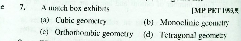 A match box exhibits (a) Cubic geometry (b) Monoclinic geometry (c) Orthorhombic geometry (d) tetragonal geometry A match box exhibits (a) Cubic geometry (b) Monoclinic geometry (c) Orthorhombic geometry (d) Tetragonal geometry February 9, 2021 Category: Uncategorised (JEE Advanced Physics by BM Sharma + GMP Solutions) , Facebook Messenger WhatsApp Share this:TwitterFacebook Related