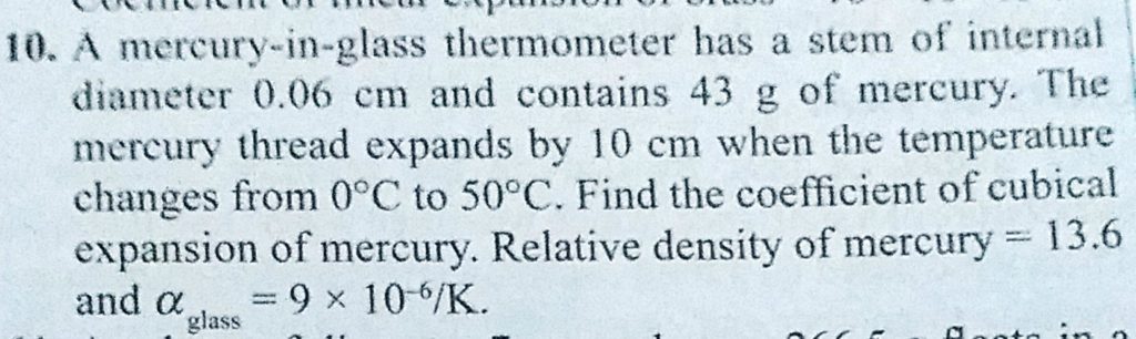 A mercury-in-glass thermometer has a stem of internal diameter 0.06 cm and contains 43 g of mercury. The mercury thread expands by 10 cm when the temperature changes from 0 C to 50 C. A mercury-in-glass thermometer has a stem of internal diameter 0.06 cm and contains 43 g of mercury. The mercury thread expands by 10 cm when the temperature changes from 0 C to 50 C. October 23, 2020 Category: Uncategorised (JEE Advanced Physics by BM Sharma + GMP Solutions) , Facebook Messenger WhatsApp Share this:TwitterFacebook Related