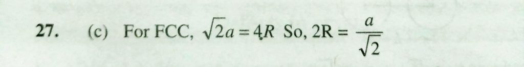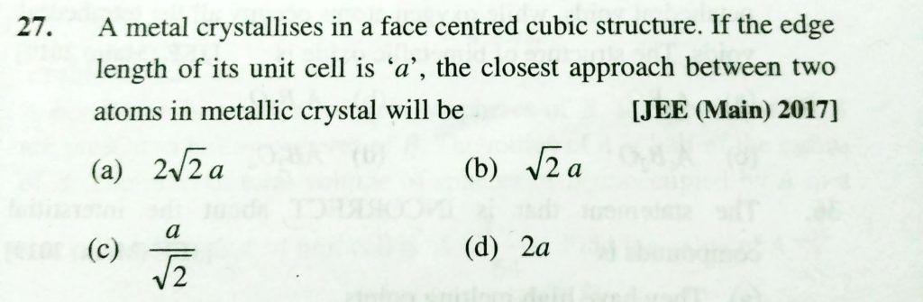 A metal crystallizes in a face centred cubic structure . If the edge length of its unit cell is ‘a’ , the closest approach between two atoms in metallic crystal will be A metal crystallizes in a face centred cubic structure . If the edge length of its unit cell is 'a' the closest approach between two atoms in metallic crystal will be February 9, 2021 Category: Uncategorised (JEE Advanced Physics by BM Sharma + GMP Solutions) , Facebook Messenger WhatsApp Share this:TwitterFacebook Related