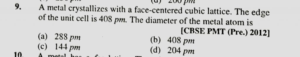 A metal crystallizes with a face – centred cubic lattice. The edge of the unit cell is 408 pm. The diameter of the metal atom is A metal crystallizes with a face - centred cubic lattice. The edge of the unit cell is 408 pm. The diameter of the metal atom is December 16, 2020 Category: Uncategorised (JEE Advanced Physics by BM Sharma + GMP Solutions) , Facebook Messenger WhatsApp Share this:TwitterFacebook Related