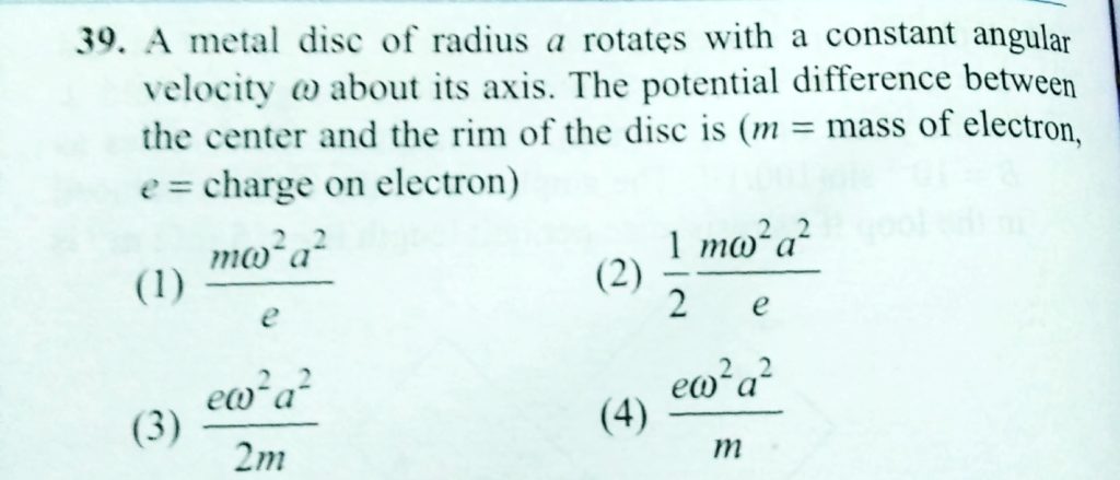 A metal disc of radius a rotates with a constant angular velocity ω about its axis. The potential difference between the center and the rim of the disc is (m = mass of electron, e = charge on electron) A metal disc of radius a rotates with a constant angular velocity ω about its axis. The potential difference between the center and the rim of the disc is (m = mass of electron e = charge on electron) October 20, 2020 Category: Uncategorised (JEE Advanced Physics by BM Sharma + GMP Solutions) , Facebook Messenger WhatsApp Share this:TwitterFacebook Related