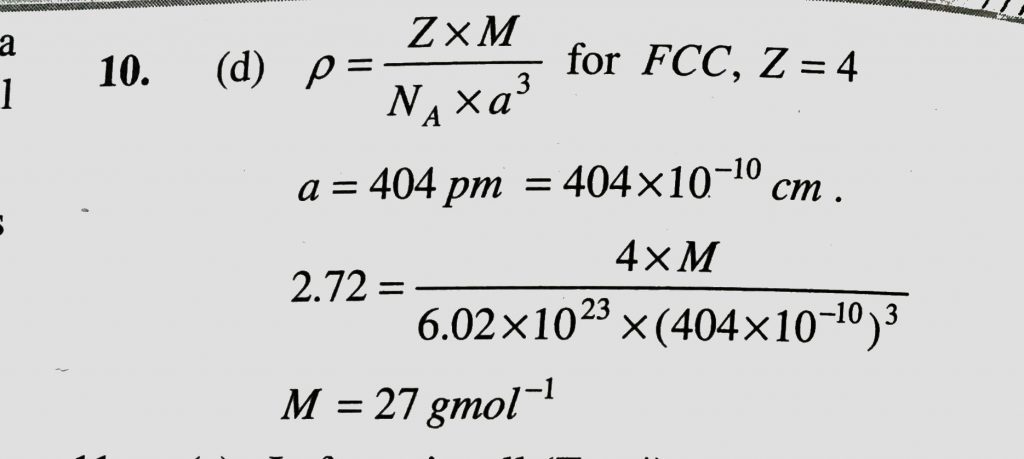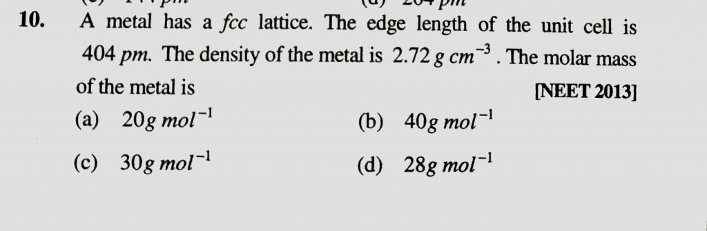 A metal has a fcc lattice. The edge length of a unit cell is 404 pm. The density of the metal is 2.72 g/cm. The molar mass of the metal is A metal has a fcc lattice. The edge length of a unit cell is 404 pm. The density of the metal is 2.72 g/cm. The molar mass of the metal is December 16, 2020 Category: Uncategorised (JEE Advanced Physics by BM Sharma + GMP Solutions) , Facebook Messenger WhatsApp Share this:TwitterFacebook Related