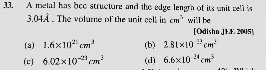 A metal has bcc structure and the edge length of its unit cell is 3.04 A. The volume of the unit cell in cm^3 will be A metal has bcc structure and the edge length of its unit cell is 3.04 A. The volume of the unit cell in cm^3 will be December 17, 2020 Category: Uncategorised (JEE Advanced Physics by BM Sharma + GMP Solutions) , Facebook Messenger WhatsApp Share this:TwitterFacebook Related
