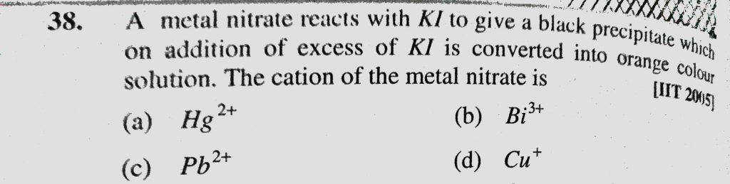 A metal nitrate reacts with KI to give a black precipitate which on addition of excess of KI is converted into orange colour solution. The cation of the metal nitrate is (a) Hg 2+ (b) Bi 3+ A metal nitrate reacts with KI to give a black precipitate which on addition of excess of KI is converted into orange colour solution. The cation of the metal nitrate is (a) Hg 2+ (b) Bi 3+ December 8, 2020 Category: Uncategorised (JEE Advanced Physics by BM Sharma + GMP Solutions) , Facebook Messenger WhatsApp Share this:TwitterFacebook Related