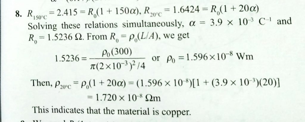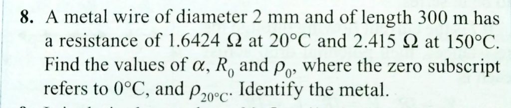 A metal wire of diameter 2 mm and of length 300 m has a resistance of 1.6424 ohm at 20 degree and 2..415 ohm at 150 degree at 150 degree . Find the values of alpha , R0 and rho0, where the zero subscript refers to 0 degree C , and rho 20 degree c. Identify the metal.