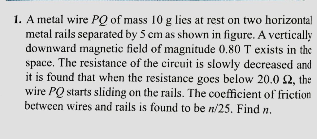 A metal wire PQ of mass 10 g lies at rest on two horizontal metal rails separated by 5 cm as shown in Fig. A vertically downward magnetic field of magnitude 0.80 T exist in the space. The resistance of the circuit is slowly decreased and it is found that when the resistance goes below 20.0 Ω the wire PQ starts sliding on the rails. The coefficient of friction between wires and rails is found. The coefficient of friction between wires and rails is found to be n/25. find n