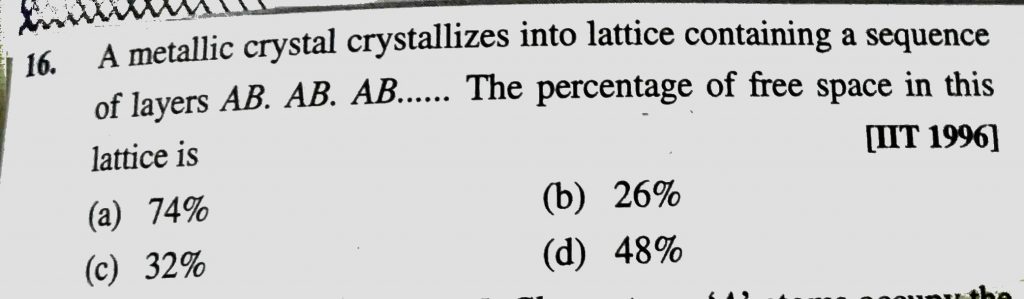 A metallic crystal crystallizes into lattice containing a sequence of layers AB. AB. AB……. The percentage of free space in this lattice is A metallic crystal crystallizes into lattice containing a sequence of layers AB. AB. AB....... The percentage of free space in this lattice is December 17, 2020 Category: Uncategorised (JEE Advanced Physics by BM Sharma + GMP Solutions) , Facebook Messenger WhatsApp Share this:TwitterFacebook Related