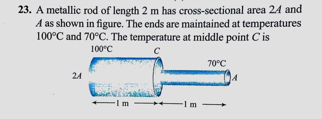 A metallic rod of length 2 m has cross-sectional area 2A and A as shown in figure. The ends are maintained at temperatures 100 C and 70 C. The temperature at middle point C is A metallic rod of length 2 m has cross-sectional area 2A and A as shown in figure. The ends are maintained at temperatures 100 C and 70 C. The temperature at middle point C is October 25, 2020 Category: Uncategorised (JEE Advanced Physics by BM Sharma + GMP Solutions) , Facebook Messenger WhatsApp Share this:TwitterFacebook Related