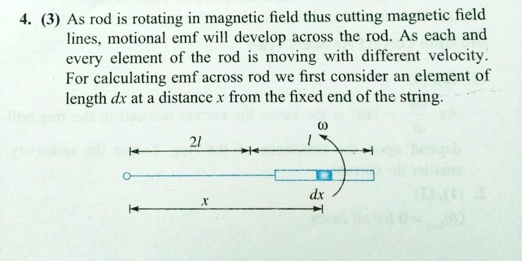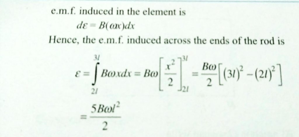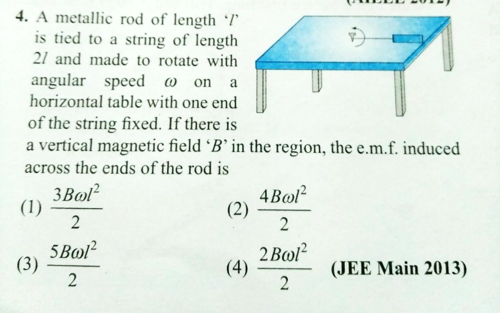 A metallic rod of length ‘l’ is tied to a string of length 2l and made to rotate with angular speed w on a horizontal table with one end of the string fixed. If there is a vertical magnetic field ‘B’ in the region, the e.m.f. Induced across the ends of the rod is
