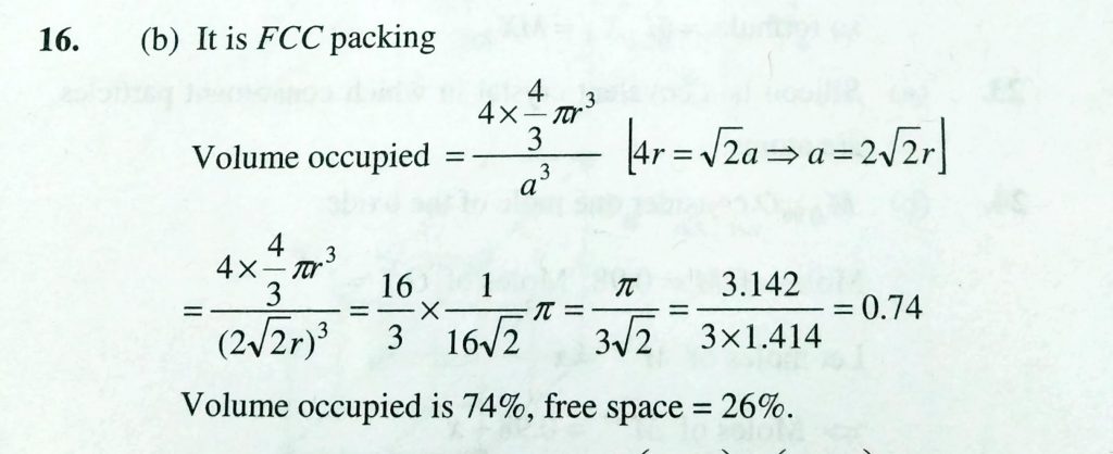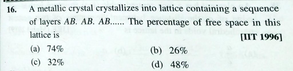 A metallic crystal crystallizes into lattice containing a sequence of layers AB. AB. AB……….. The percentage of free space in this lattice is (a) 74% (b) 26% (c) 32% (d) 48% A metallic crystal crystallizes into lattice containing a sequence of layers AB. AB. AB........... The percentage of free space in this lattice is (a) 74% (b) 26% (c) 32% (d) 48% February 9, 2021 Category: Uncategorised (JEE Advanced Physics by BM Sharma + GMP Solutions) , Facebook Messenger WhatsApp Share this:TwitterFacebook Related