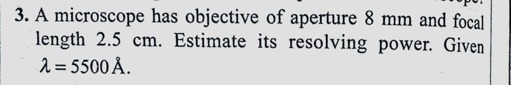 A microscope has objective of aperture 8 mm and focal length 2.5 cm. Estimate its resolving power. Given lemda = 5500 A. A microscope has objective of aperture 8 mm and focal length 2.5 cm. Estimate its resolving power. Given lemda = 5500 A. October 11, 2020 Category: Uncategorised (JEE Advanced Physics by BM Sharma + GMP Solutions) , Facebook Messenger WhatsApp Share this:TwitterFacebook Related