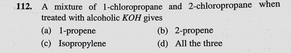 A mixture of 1-chloropropane and 2-chloropropane when treated with alcoholic KOH gives (a) 1-propene (b) 2-propene (c) Isopropylene (d) All of these A mixture of 1-chloropropane and 2-chloropropane when treated with alcoholic KOH gives (a) 1-propene (b) 2-propene (c) Isopropylene (d) All of these December 14, 2020 Category: Uncategorised (JEE Advanced Physics by BM Sharma + GMP Solutions) , Facebook Messenger WhatsApp Share this:TwitterFacebook Related