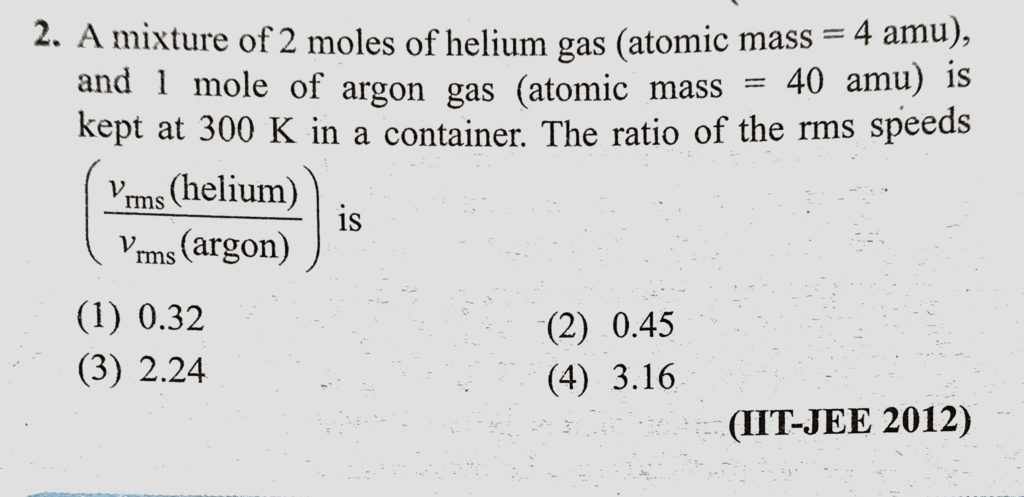 A mixture of 2 moles of helium gas (atomic mass = 4 amu), and 1 mole of argon gas (atomic mass = 40 amu) is kept at 300 K in a container. The ratio of the rms speeds A mixture of 2 moles of helium gas (atomic mass = 4 amu) and 1 mole of argon gas (atomic mass = 40 amu) is kept at 300 K in a container. The ratio of the rms speeds October 28, 2020 Category: Uncategorised (JEE Advanced Physics by BM Sharma + GMP Solutions) , Facebook Messenger WhatsApp Share this:TwitterFacebook Related
