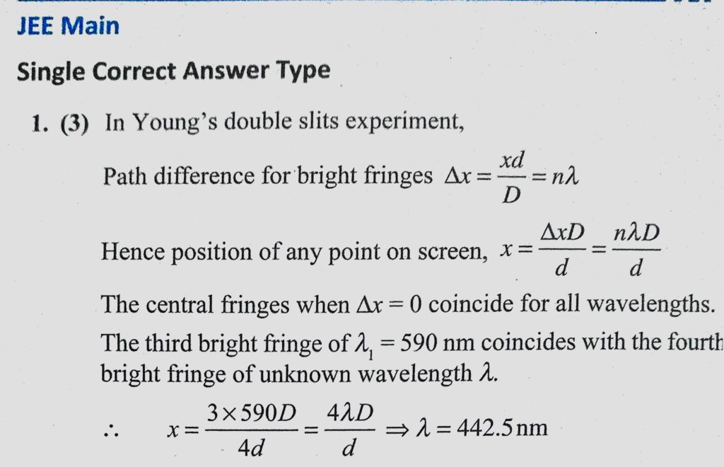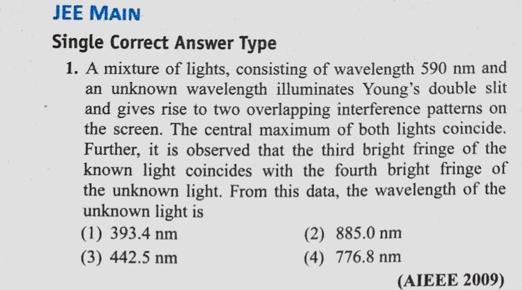 A mixture of lights, consisting of wavelength 590 nm and an unknown wavelength illuminates Young’s double slit and gives rise to two overlapping interference patterns on A mixture of lights consisting of wavelength 590 nm and an unknown wavelength illuminates Young's double slit and gives rise to two overlapping interference patterns on October 11, 2020 Category: Uncategorised (JEE Advanced Physics by BM Sharma + GMP Solutions) , Facebook Messenger WhatsApp Share this:TwitterFacebook Related