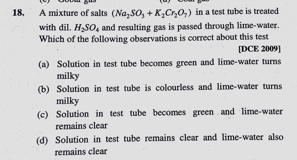 A mixture of salts (Na2SO3 + K2Cr2O7) in a test tube is treated with dil. H2SO4 and resulting gas is passed through lime-water. Which of the following observations is correct about this test A mixture of salts (Na2SO3 + K2Cr2O7) in a test tube is treated with dil. H2SO4 and resulting gas is passed through lime-water. Which of the following observations is correct about this test December 6, 2020 Category: Uncategorised (JEE Advanced Physics by BM Sharma + GMP Solutions) , Facebook Messenger WhatsApp Share this:TwitterFacebook Related
