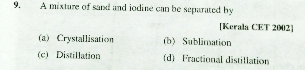A mixture of sand and iodine can be seperated by (a) crystallisation (b) sublimation (c) distillation (d) fractional distillation A mixture of sand and iodine can be seperated by (a) crystallisation (b) sublimation (c) distillation (d) fractional distillation November 18, 2020 Category: Uncategorised (JEE Advanced Physics by BM Sharma + GMP Solutions) , Facebook Messenger WhatsApp Share this:TwitterFacebook Related