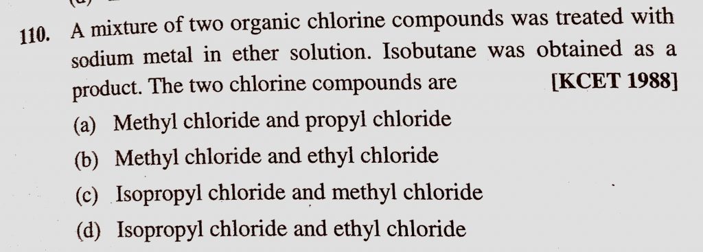 A mixture of two organic chlorine compounds was treated with sodium metal in ether solution. Isobutane was obtained as a product. The two chlorine compounds are A mixture of two organic chlorine compounds was treated with sodium metal in ether solution. Isobutane was obtained as a product. The two chlorine compounds are February 8, 2021 Category: Uncategorised (JEE Advanced Physics by BM Sharma + GMP Solutions) , Facebook Messenger WhatsApp Share this:TwitterFacebook Related