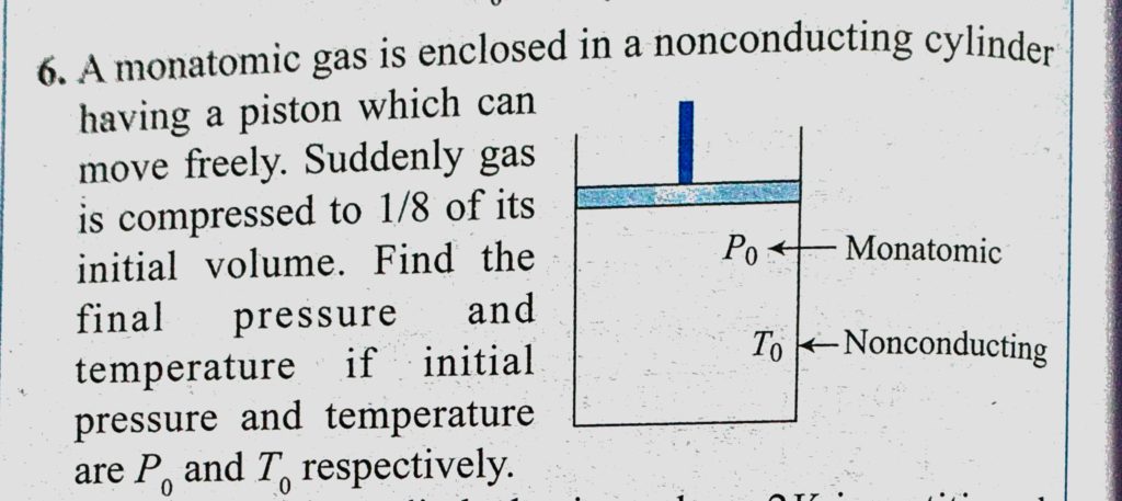 A monatomic gas is enclosed in a nonconducting cylinder having a piston which can move freely. Suddenly gas is compressed to 1/8 of its initial volume. Find the final pressure A monatomic gas is enclosed in a nonconducting cylinder having a piston which can move freely. Suddenly gas is compressed to 1/8 of its initial volume. Find the final pressure October 28, 2020 Category: Uncategorised (JEE Advanced Physics by BM Sharma + GMP Solutions) , Facebook Messenger WhatsApp Share this:TwitterFacebook Related