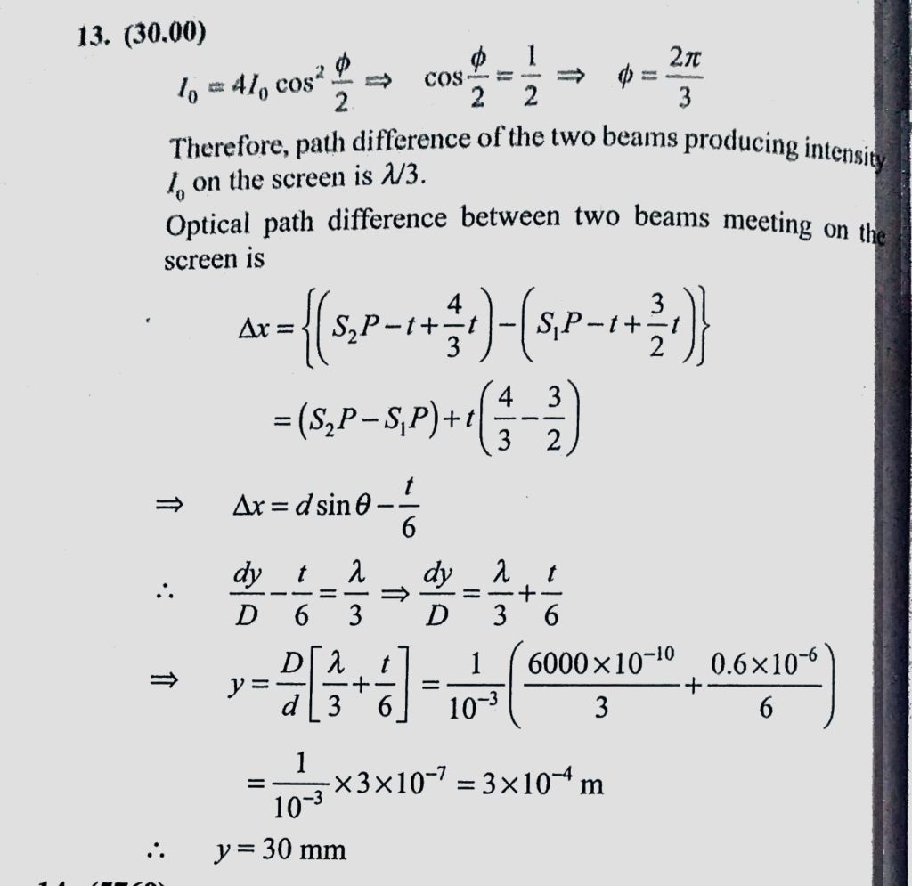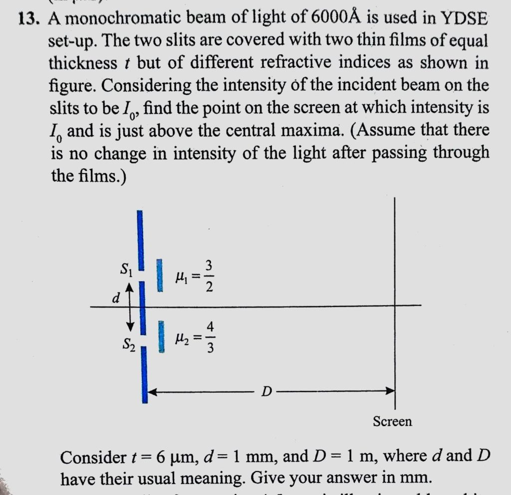 A monochromatic beam of light of 6000 A is used in YDSE set-up. The two slits are covered with two thin films of equal thickness t but of different refractive indices as shown in figure. A monochromatic beam of light of 6000 A is used in YDSE set-up. The two slits are covered with two thin films of equal thickness t but of different refractive indices as shown in figure. October 11, 2020 Category: Uncategorised (JEE Advanced Physics by BM Sharma + GMP Solutions) , Facebook Messenger WhatsApp Share this:TwitterFacebook Related