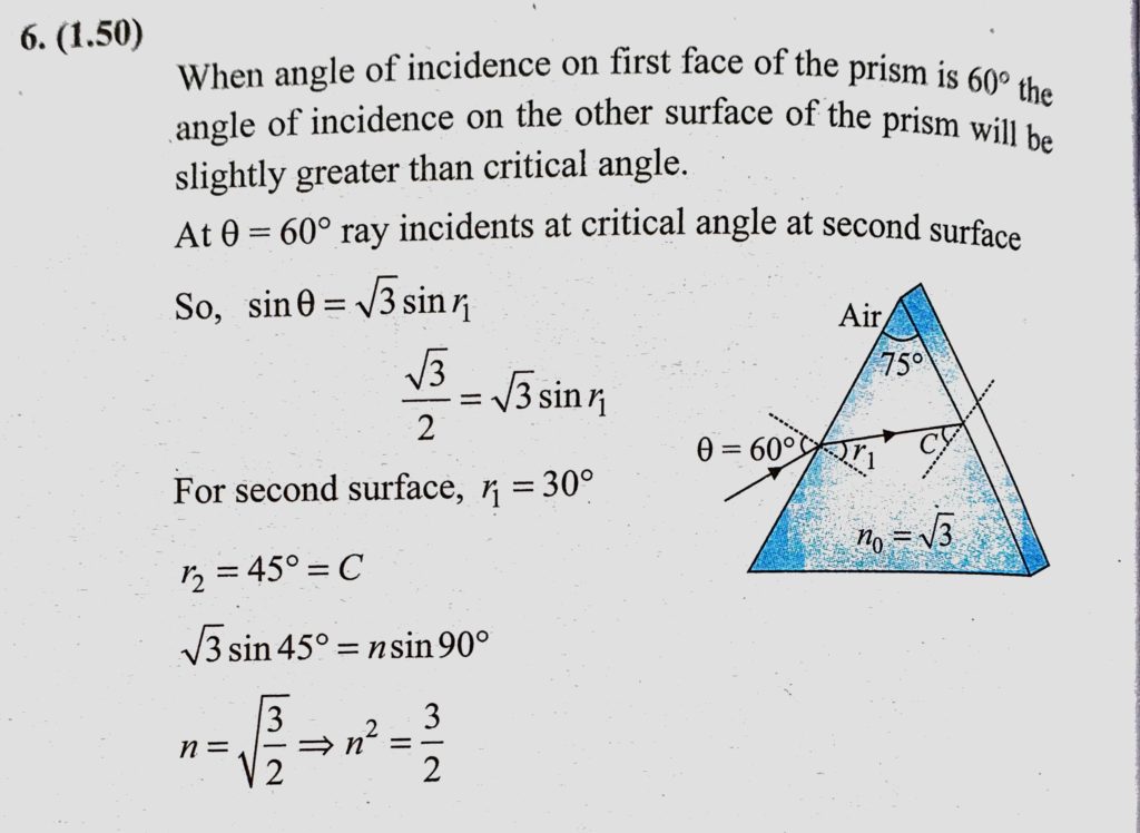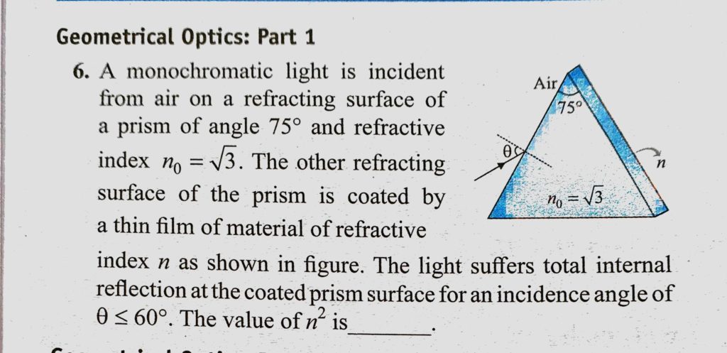 A monochromatic light is incident from air on a refracting surface of a prism of angle 75 and refractive index n0 = root 3. The other refracting surface of the prism is coated by a thin film A monochromatic light is incident from air on a refracting surface of a prism of angle 75 and refractive index n0 = root 3. The other refracting surface of the prism is coated by a thin film October 23, 2020 Category: Uncategorised (JEE Advanced Physics by BM Sharma + GMP Solutions) , Facebook Messenger WhatsApp Share this:TwitterFacebook Related