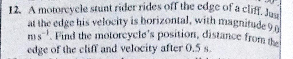 A motorcycle stunt rider rides off the edge of a cliff. Just at the edge his velocity is horizontal, with magnitude 9.0 m/s. Find the motorcycle’s position, distance from the edge of the cliff and velocity after 0.5 s. A motorcycle stunt rider rides off the edge of a cliff. Just at the edge his velocity is horizontal distance from the edge of the cliff and velocity after 0.5 s. with magnitude 9.0 m/s. Find the motorcycle's position September 21, 2020 Category: Uncategorised (JEE Advanced Physics by BM Sharma + GMP Solutions) , Facebook Messenger WhatsApp Share this:TwitterFacebook Related