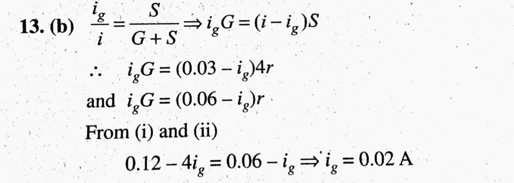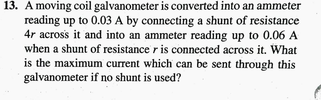 A moving coil galvanometer is converted into an ammeter reads up to 0.03 A by connecting a shunt of resistance 4r across it and ammeter reads up 0.06 A, when a shunt of resistance r is used. What is the maximum current which can be sent through this galvanometer if no shunt is used ?