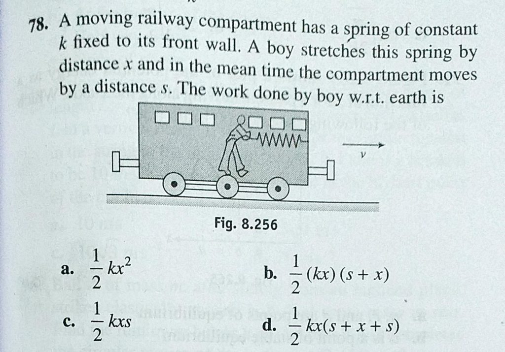 A moving railway compartment has a spring of constant k fixed to its front wall. A boy stretches this spring by distance x and in the mean time the compartment moves by a distance s. A moving railway compartment has a spring of constant k fixed to its front wall. A boy stretches this spring by distance x and in the mean time the compartment moves by a distance s. October 4, 2020 Category: Uncategorised (JEE Advanced Physics by BM Sharma + GMP Solutions) , Facebook Messenger WhatsApp Share this:TwitterFacebook Related