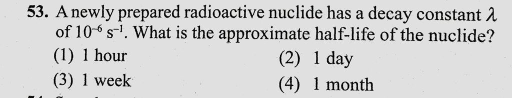 A newly prepared radioactive nuclide has a decay constant lemda of 10^-6 s^-1. What is the approximate half-life of the nuclide ? A newly prepared radioactive nuclide has a decay constant lemda of 10^-6 s^-1. What is the approximate half-life of the nuclide ? October 18, 2020 Category: Uncategorised (JEE Advanced Physics by BM Sharma + GMP Solutions) , Facebook Messenger WhatsApp Share this:TwitterFacebook Related