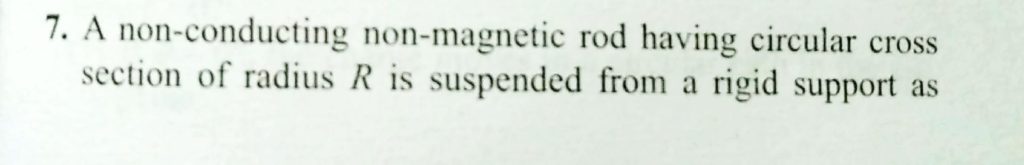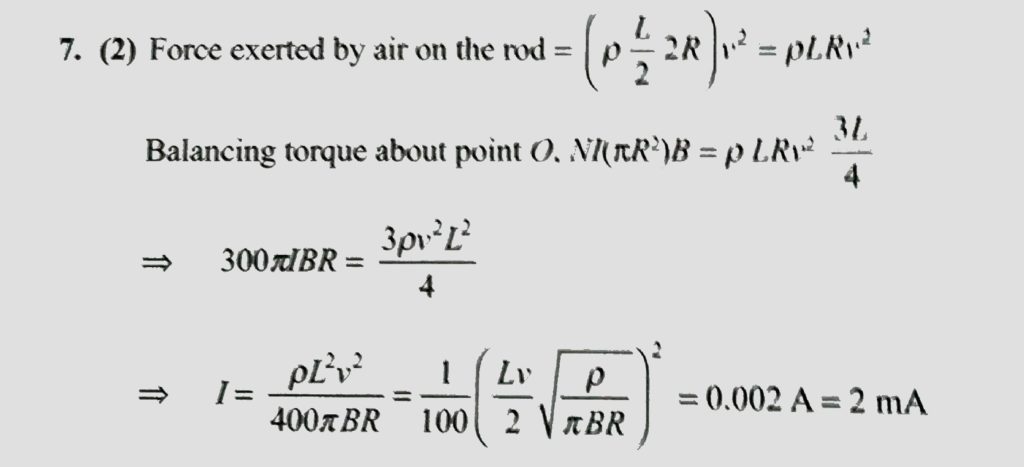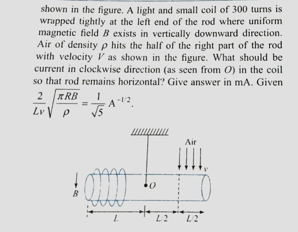 A non-conducting rod having circular cross section of radius R is suspended from a rigid support as shown in fig. A light and small coil of 300turns is wrapped tightly at the left end where uniform magnetic filed B exists in vertically downward direction. Air of density ρ hits the half of the right part of the rod with velocity V as shown in the fig. What should be current in clockwise direction (as seen from O) in the coil so that rod remains horizontal? Give answer in mA.