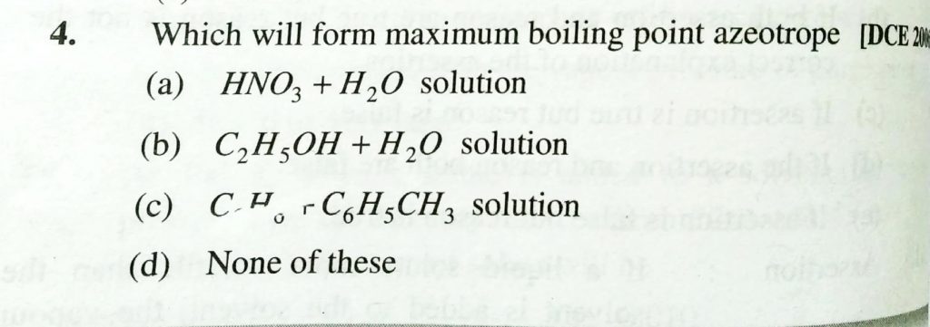 Which will form maximum boiling point azeotrope (a) HNO3 + H2O solution (b) C2H5OH + H2O solution (c) C6H6 + C6H5CH3 solution (d) None of these Which will form maximum boiling point azeotrope (a) HNO3 + H2O solution (b) C2H5OH + H2O solution (c) C6H6 + C6H5CH3 solution (d) None of these December 13, 2020 Category: Uncategorised (JEE Advanced Physics by BM Sharma + GMP Solutions) , Facebook Messenger WhatsApp Share this:TwitterFacebook Related